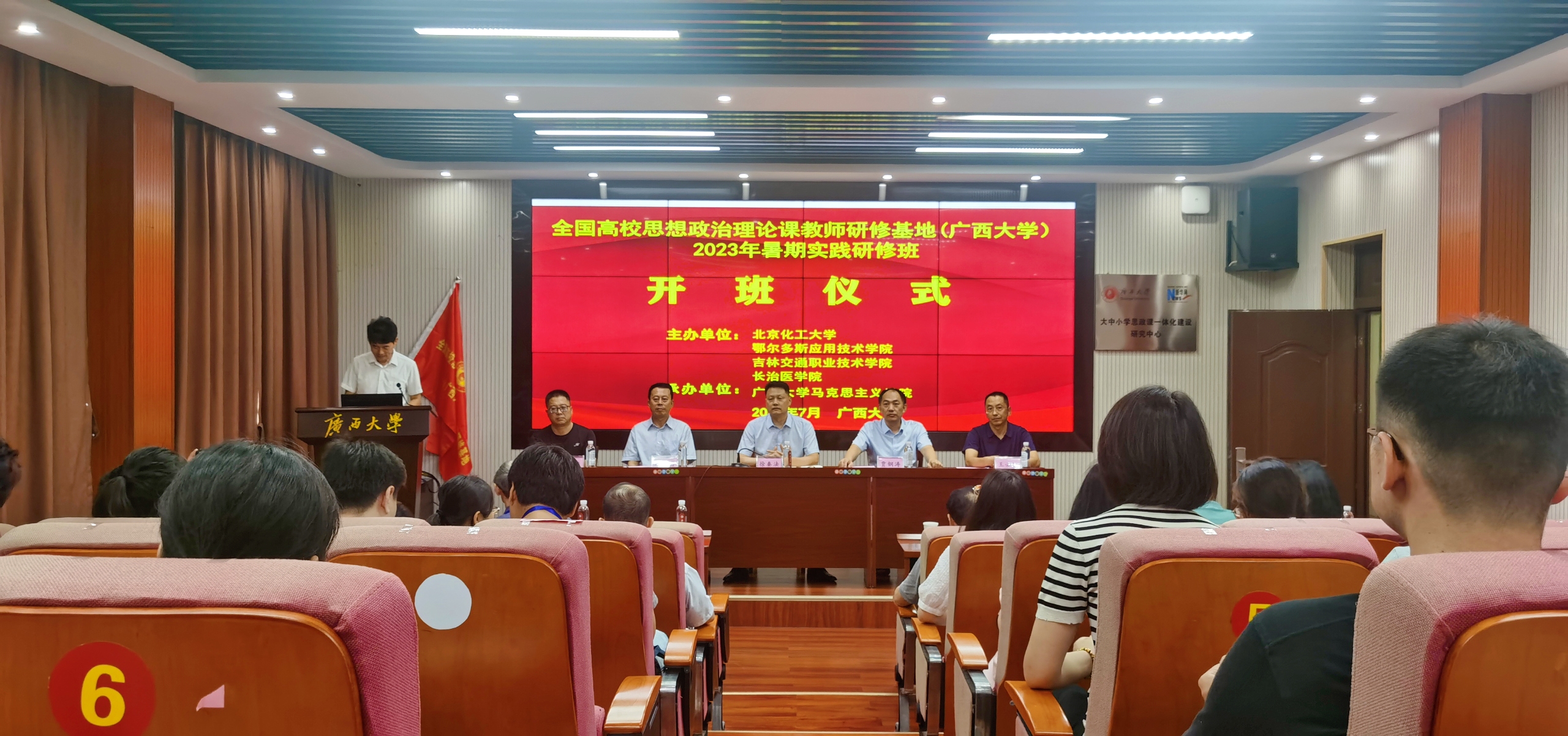 7月4日上午,实践研修活动开班仪式顺利举行。全国高校思政理论课教师实践研修基地(广西大学)负责人徐秦法、北京化工大学马克思主义学院党委书记罗兵、院长贾钢涛等领导同志出席开班式。学院教师研修团队全体参加,青年教师车辕副教授作为学员代表在授旗仪式上接旗。