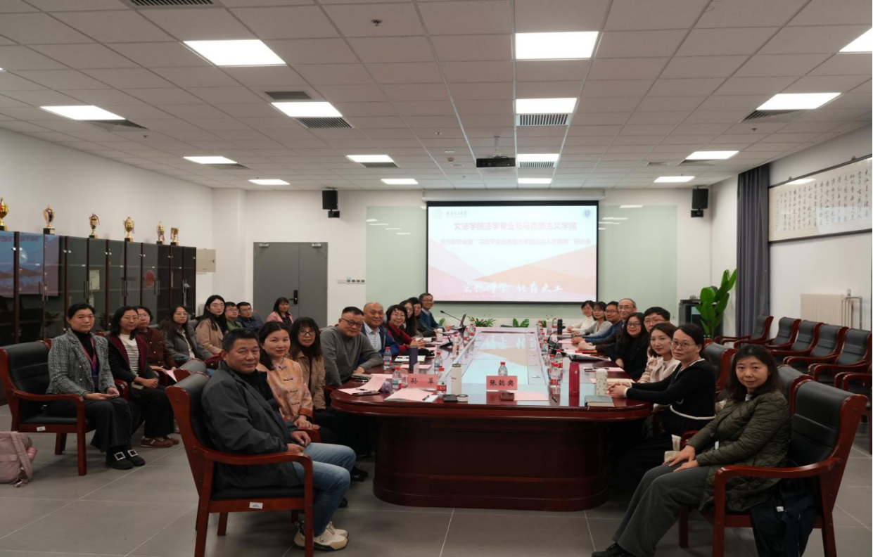 为持续推进党的创新理论有机融入思政课与专业课教学,落实北京化工大学《深入推进课程思政建设实施方案》《关于推进课程思政工作的若干意见》等文件精神,促进课程思政与思政课程同向同行,2025年11月14日下午,在昌平校区文理楼114会议室,中国近现代史纲要(以下简称“纲要”)教研室与文法学院法学专业以“习近平法治思想与卓越法治人才培养”为主题,联合举办课程思政与思政课程合作教研会。文法学院领导班子、系部主任和教师代表,马克思主义学院党委书记罗兵、纲要教研室全体教师参加本次研讨会。会议由刘国菊教授主持。