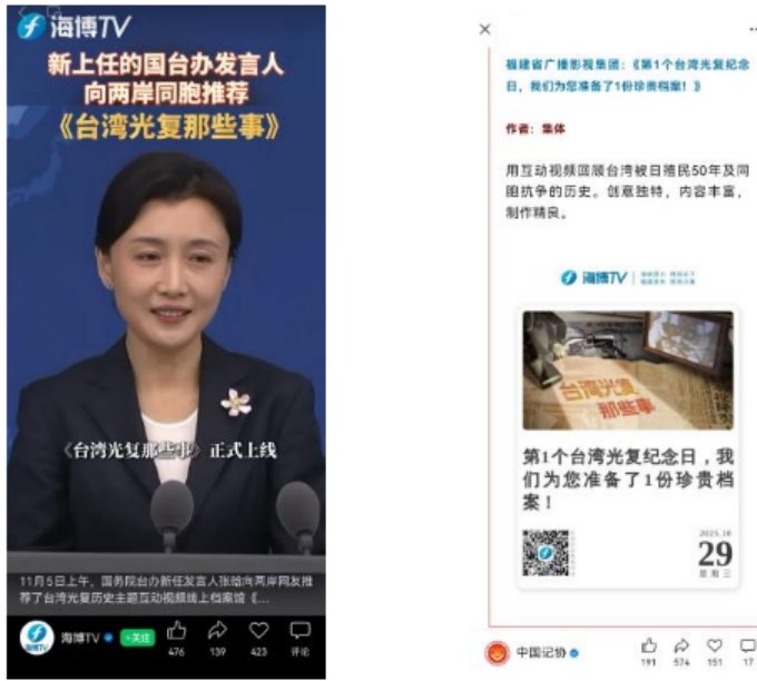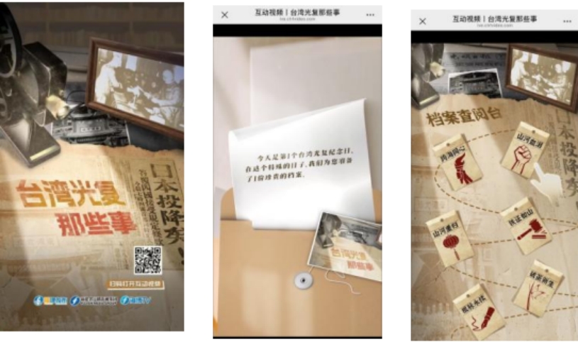 同时,为积极响应2025年10月24日全国人大常委会表决通过“设立10月25日为台湾光复纪念日”这一国家立法举措,于10月25日当天,即第一个台湾光复纪念日,以其中18支主题视频为核心,结合互动体验形式,推出了台湾光复历史主题互动视频线上档案馆。该线上档案馆是以数字化、互动化创新形式让历史档案“活”起来、光复记忆“动”起来,旨在通过创新表达,帮助两岸同胞特别是台湾年轻一代在沉浸体验中走近历史真相,在互动参与中铸牢民族认同。该互动视频在福建发布微信公众号、海博tv客户端、中国福建facebook(境外)、 华人头条客户端(境外)等平台同步上线,截至11月5日在境内外传播超过300万,在境外华人头条APP上阅读量超过100万。