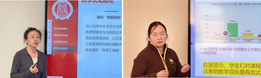 主题发言环节,“毛概”教研室刘萍老师针对《社会主义道路探索史》课程进行学情汇报。她结合学生基础情况与课程评价反馈,分析了我校大学生对思政课的态度取向,提出学生更喜爱的教学形式包括“案例化与故事化”“互动性与参与感”“与现实紧密结合”等内容,并在此基础上分享了思政课程与课程思政何以强化现实回应、如何应用案例教学的具体方法。“毛概”教研室李霞老师针对《毛泽东思想和中国特色社会主义理论体系概论》课程进行心得分享。她基于学情调研数据阐述了目前课程亮点与提升空间,并对未来思政课教学如何提升针对性、实效性提出建议,包括深化“理工科思维”融合教学、探索多元互动教学模式、加强院际合作与资源共享等。