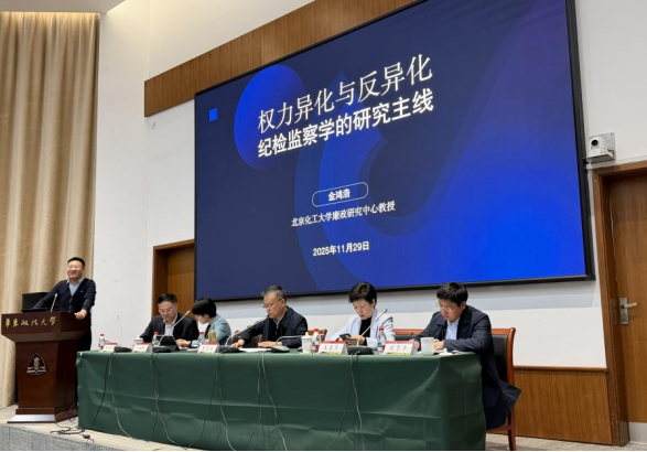 校廉政研究中心执行主任金鸿浩教授以《权力异化与反异化:纪检监察学的研究主线》为题作了学术报告。对中国纪检监察学自主知识体系建构的内在逻辑、外在逻辑进行探讨,提出了应从纪检监察学研究对象的基本矛盾出发,构建“一体三维”的研究主线和理论框架,该观点受到了与会专家的肯定。