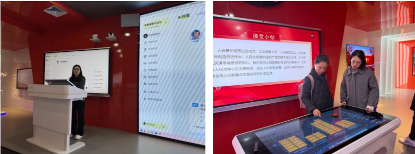 何宛怿介绍了“数智”实验室的建设理念、功能布局和创新应用情况,系统展示了实验室在人工智能、虚拟现实、增强现实等前沿技术赋能思政课方面的探索成果,重点呈现了实验室在课堂交互设计、情境体验构建和数字资源集成方面的实践路径。来访教师深入体验了“长征精神”虚拟仿真教学、AI智慧问答平台、数字红色资源库等功能模块,对中心在技术融合与教学创新上的探索表示浓厚兴趣。