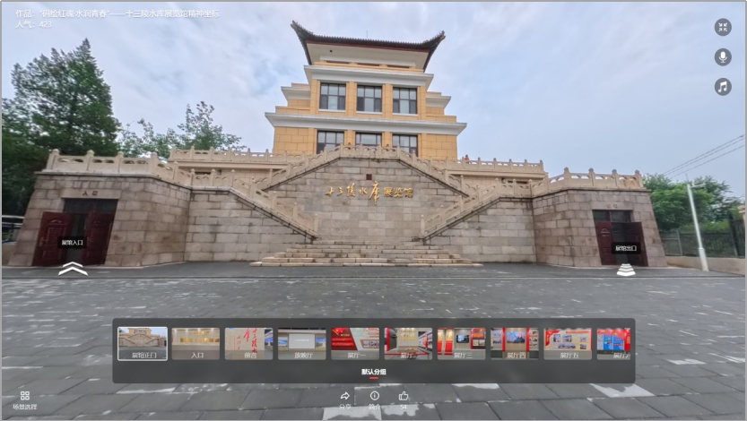 作品由学生团队多次实地调研、精心设计拍摄脚本、通力合作完成。学生深入挖掘了十三陵水库的建设历史与精神内涵,并采用全景VR与动态追踪技术,对十三陵水库的展览馆空间、历史实物及档案资料进行高精度采集,创新性融合视频介绍与艺术解析,以“水”为视觉线索,构建出交互式叙事脉络,生动还原了新中国初期十三陵水库荡气回肠的建设始末,使观众在虚拟漫游中自主探索,切身体会革命先辈们敢为人先、以身许国的壮志豪情。