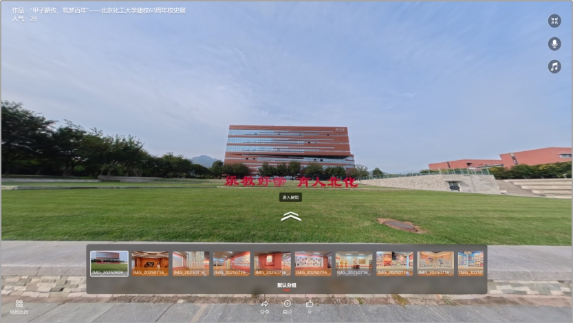该作品扎根北京化工大学建设历史,通过查阅大量档案资料与采访老校友,精心梳理了母校六十年发展脉络,通过采用全景VR与微距摄影技术进行拍摄,对北京化工大学校史馆内的珍贵文献、实物模型、荣誉证书、历史场景等进行了高精度数字化复刻,并创新融入交互式时间轴与动态数据可视化设计。该作品以“光的历程”为隐喻,构建出一条从创业维艰到今日成就的沉浸式时空长廊,让观众可通过点触展馆线索,探究北京化工大学关键历史节点,在虚拟与现实交融中深切感受母校“宏德博学、化育天工”的精神传承。