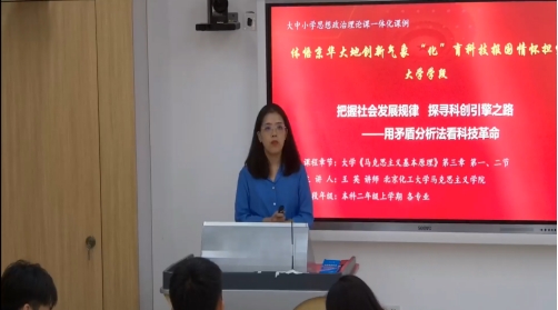 “体悟京华大地创新气象 ‘化’育科技报国情怀担当”大中小学思政课一体化课例由北京化工大学牵头,北京中学科技分校、北京化工大学附属中学等北京化工大学大中小学思政课一体化改革创新联合体成员单位参与,打造“立足京华实践、体悟创新气象、厚植科创志向、矢志报国担当”的科技创新主题一体化课例,覆盖小学、初中、高中、大学本科5门思政课必修课,共8门课程实录,视频累计10学时、450分钟,完成配套支撑教案9万字。