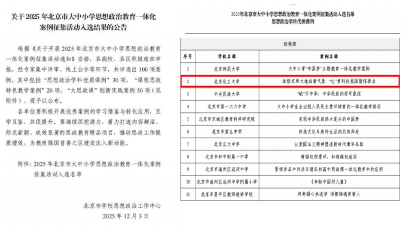 根据北京市委教育工委《关于开展2025年北京市大中小学思想政治教育一体化案例征集活动通知》,近日,北京市学校思想政治工作中心发布了《关于2025年北京市大中小思想政治教育一体化案例征集活动入选结果的公告》,全市共评选“思想政治学科优质课例”30项,其中高校获奖9项。北京化工大学“体悟京华大地创新气象‘化’育科技报国情怀担当”获评思想政治学科优质课例优秀奖。
