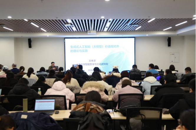 为深入学习贯彻党的二十届四中全会精神,聚焦前沿学术议题,推动跨学科理论研究,助力培养具备科技伦理素养的复合型人才,2026年1月5日上午,学院举办第五期“思源·问道”教师科研工作坊,邀请上海大学马克思主义学院孙伟平教授作题为《生成式人工智能(大模型)价值观对齐的理论与实践》的学术报告。学院领导班子、全体思政课教师及研究生参加。报告会由学院副院长陈顺伟主持。